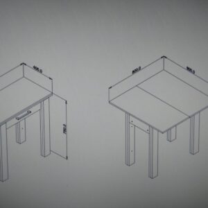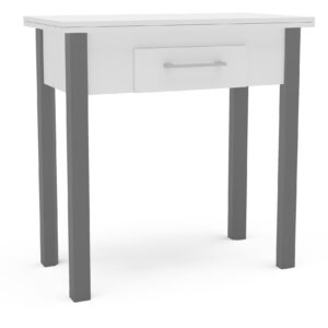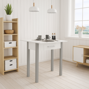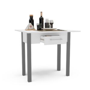 Materiales: Mesa de cocina abatible en color blanco patas grises. Acabado aglomerado melaminizado de 16 mm de espesor. Patas de madera MDF.