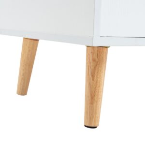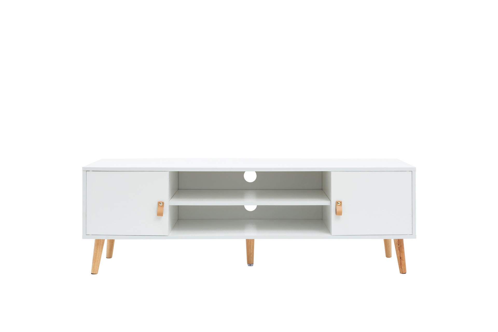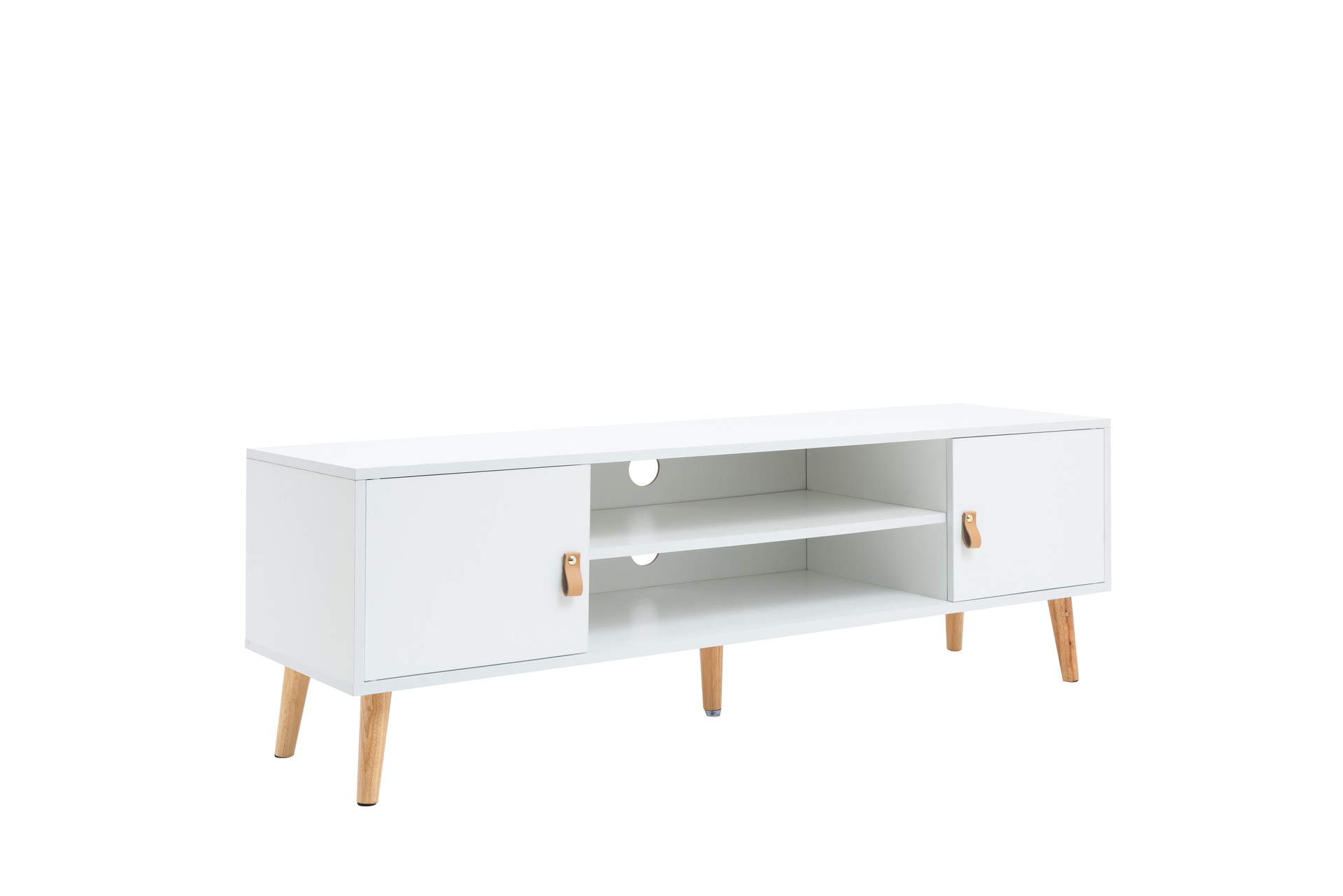 Materiales: Chasis y puertas de melamina. Tiradores de PU y patas en Madera de pino lacado.