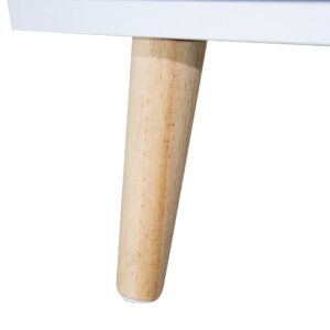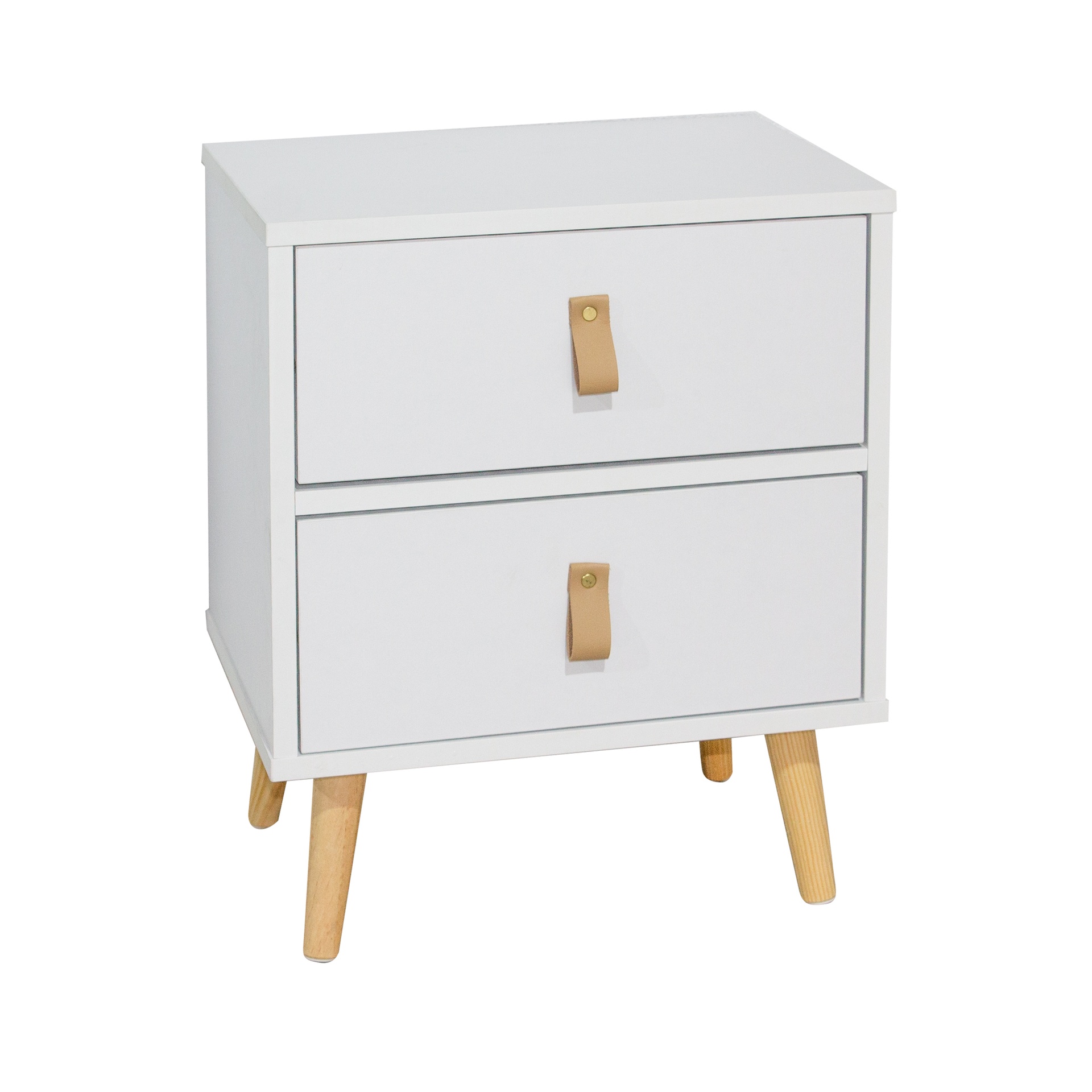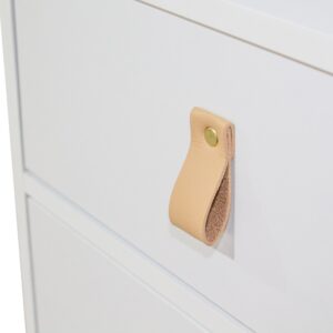 Materiales: Chasis en Melamina 15mm. Cajones con guías metálicas. Altura de cada cajón 15cm. Profundidad útil del cajón 14cm. Profundidad del cajón 25cm. Patas en madera de pino barnizadas. Tirador en PU (poliuretano) símil cuero.