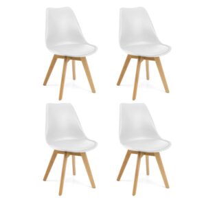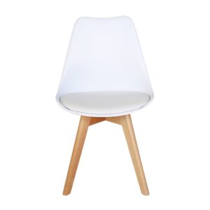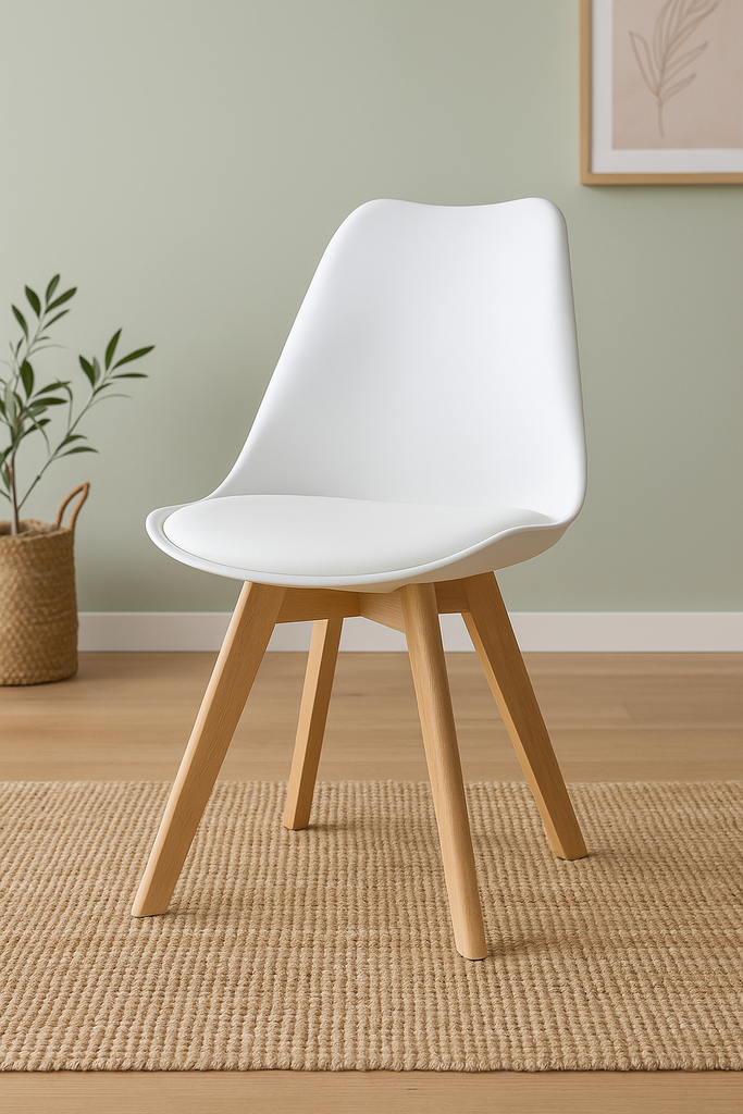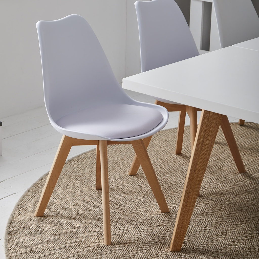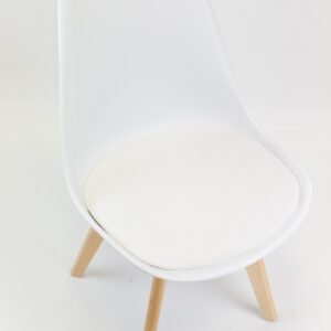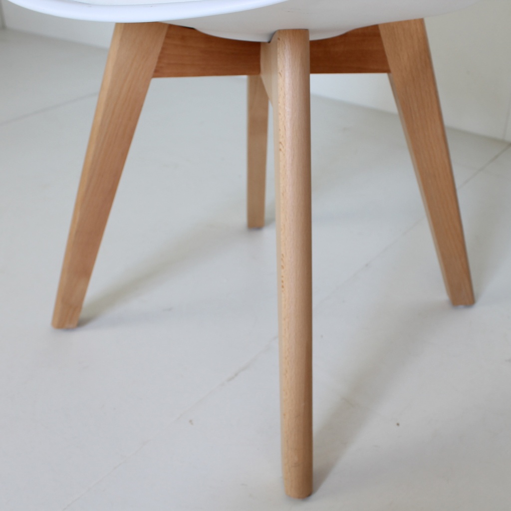 Materiales: Patas en madera 100% Haya, lacadas con un barniz que resalta su color natural. Asiento inyectado en PP (polipropileno) con cojín en PU (poliuretano) y espuma.