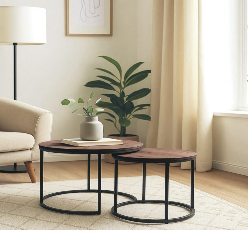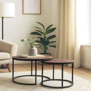 Set de mesas redondas, estructura metálica de color negro mate y sobres de MDF