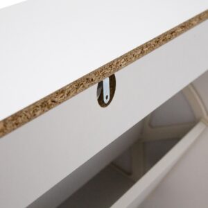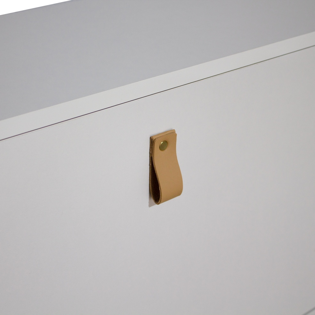 Materiales: Tablero de melamina 15mm, tiradores en simil piel PU (poliuretano). Patas en madera de pino barnizadas con un tono natural.